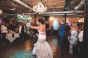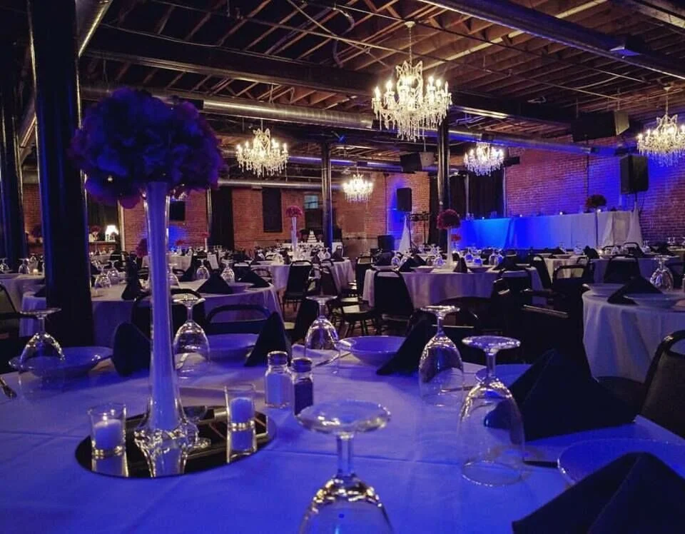 With original exposed brick walls and floors, 12 foot ceilings, 9 beautiful chandeliers, and our signature statement wall, this is the perfect venue for large weddings, coorporate parties, and other big events.